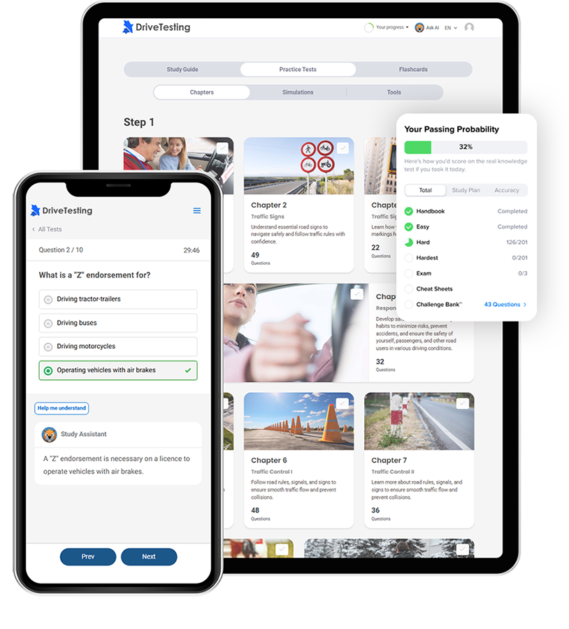 You’ll need to pass the Canadian Driving Test to earn your driver’s license. DriveTesting Premium helps you prepare with a comprehensive library of practice questions, realistic test simulations, and AI-powered tools. Our premium platform is visually engaging, boasts an industry-leading 95.3% success rate, and comes with a Pass Guarantee for your peace of mind.